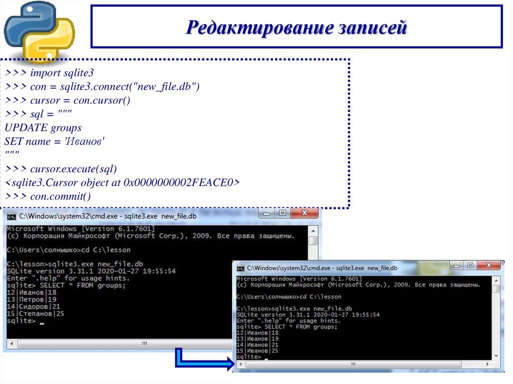 Редактирование записей>>> import sqlite3