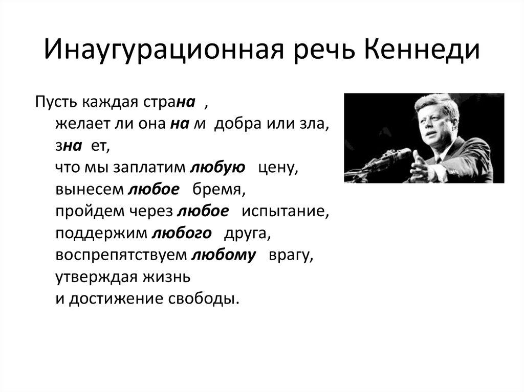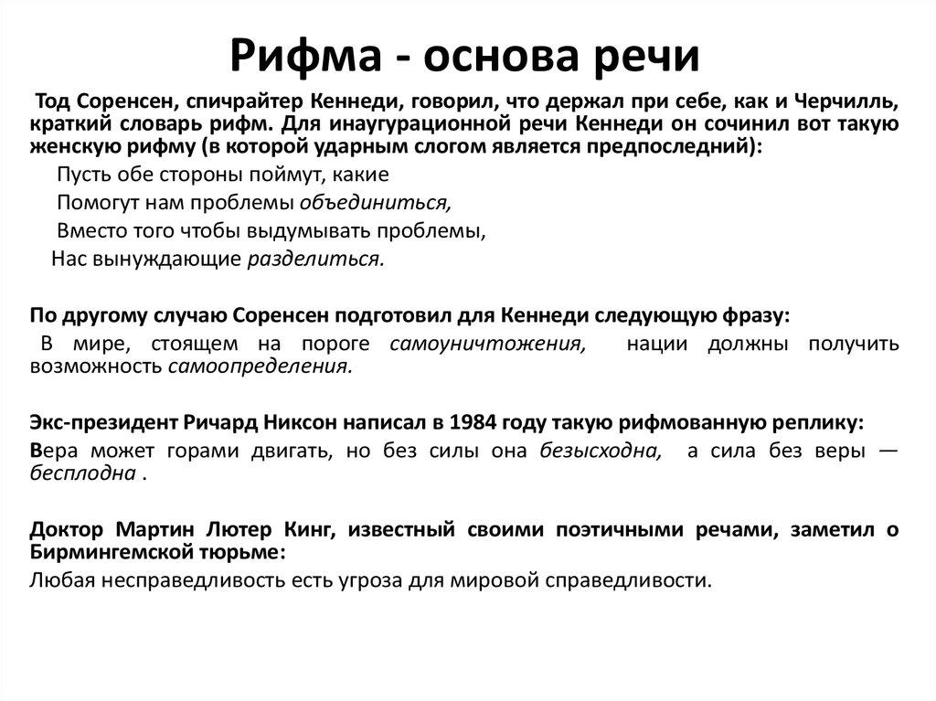 Тод Соренсен, спичрайтер Кеннеди, говорил, что держал при себе, как и Черчилль,краткий словарь рифм. Для инаугурационной речи Кеннеди он сочинил вот такую