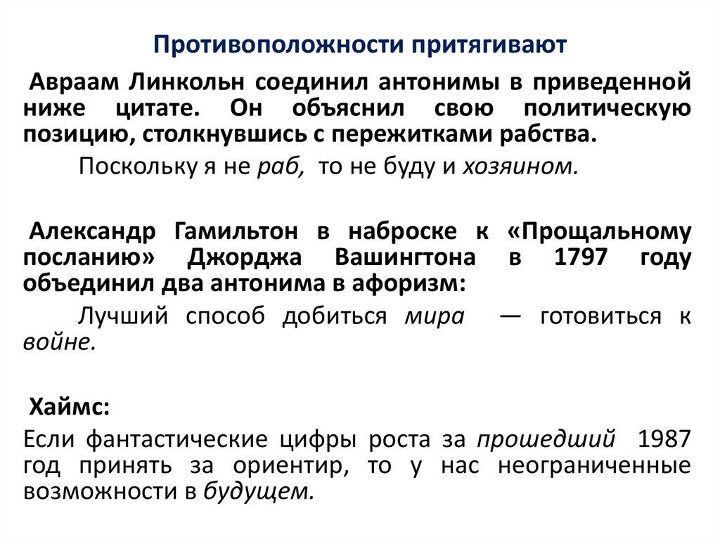 Авраам Линкольн соединил антонимы в приведеннойниже цитате. Он объяснил свою политическую