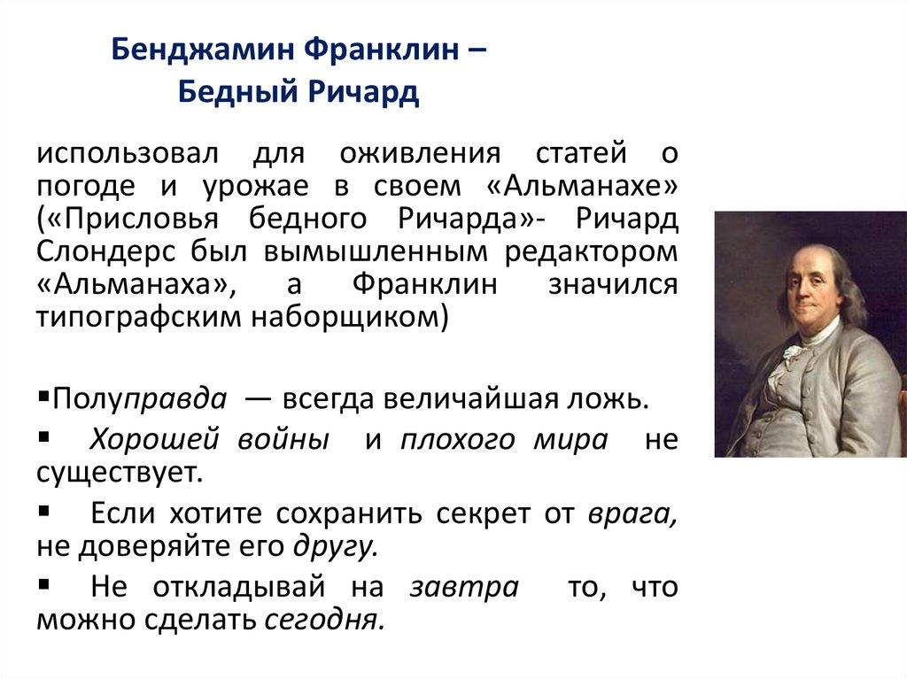 Бенджамин Франклин в своих «Присловьях бедного Ричарда» использовал более явные и