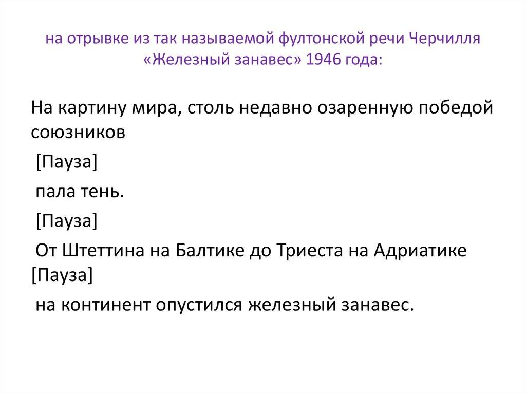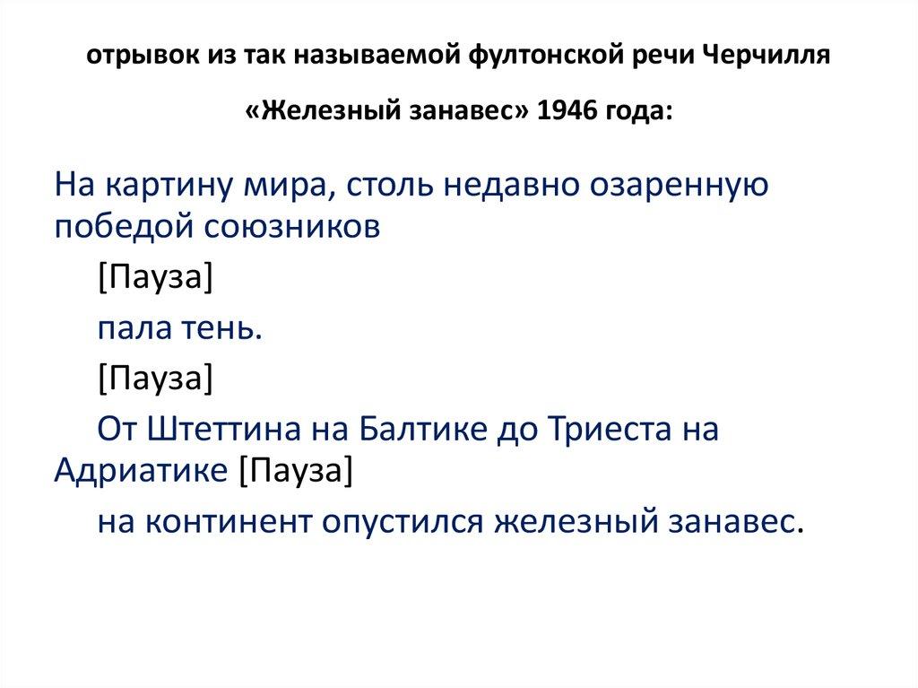 в одной из лучших своих речей в Фултоне, в Миссури, 5 марта 1946 года Черчилль строитсвою фразу о железном занавесе на рифмовке двух названий морей: