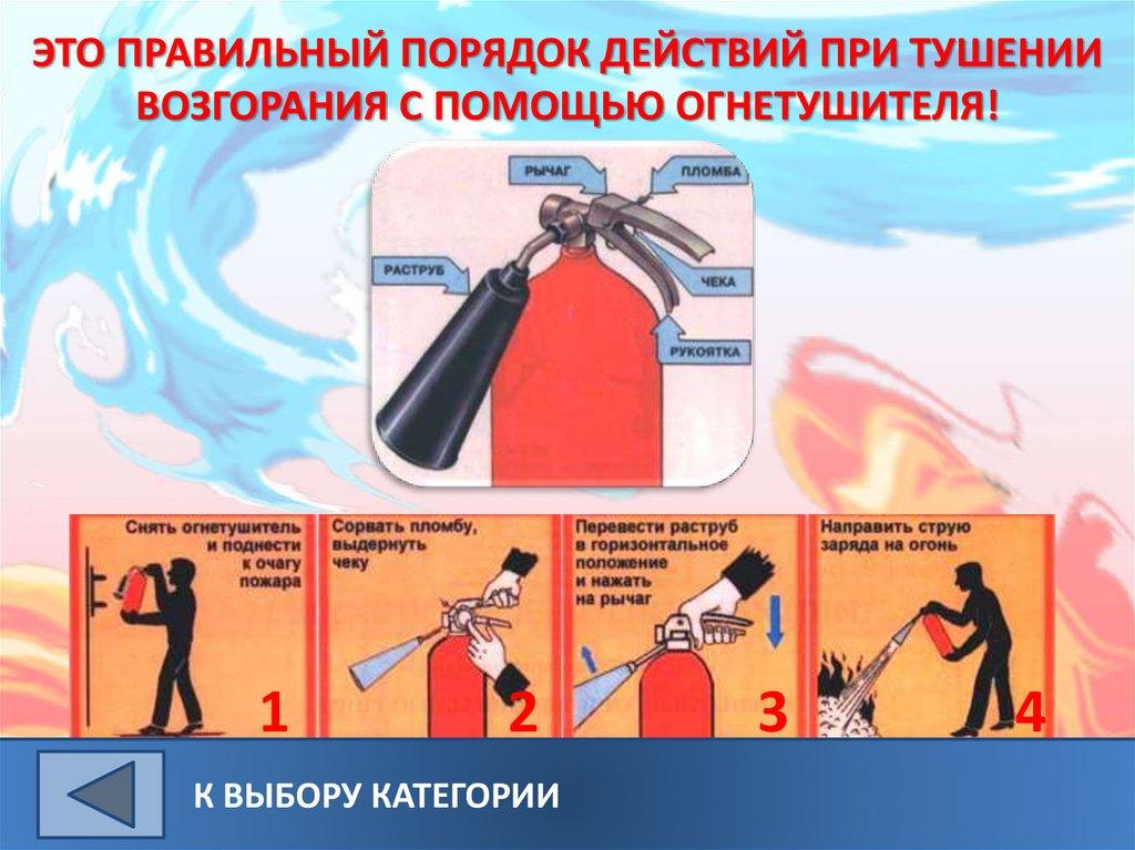 ЭТО ПРАВИЛЬНЫЙ ПОРЯДОК ДЕЙСТВИЙ ПРИ ТУШЕНИИВОЗГОРАНИЯ С ПОМОЩЬЮ ОГНЕТУШИТЕЛЯ!