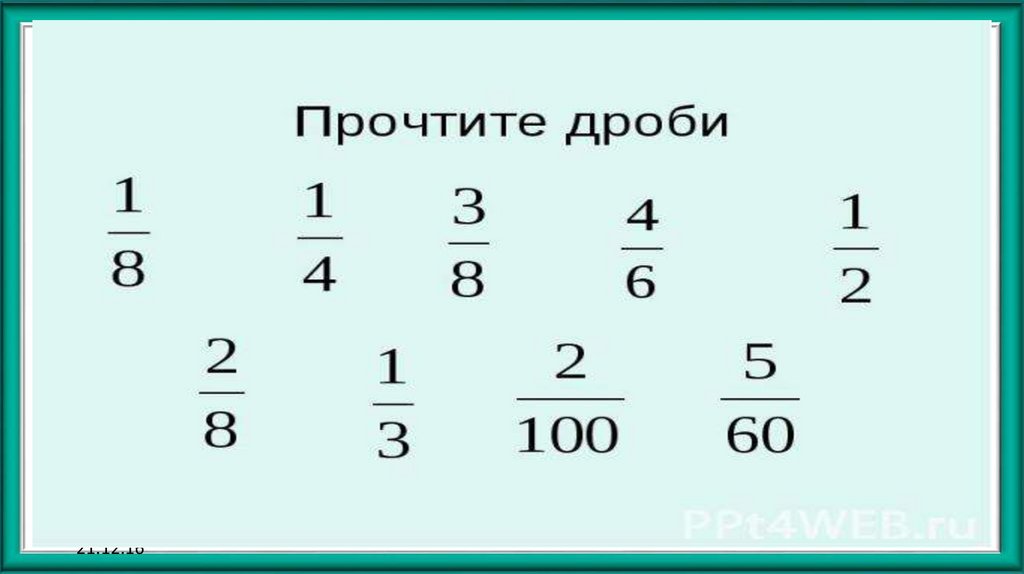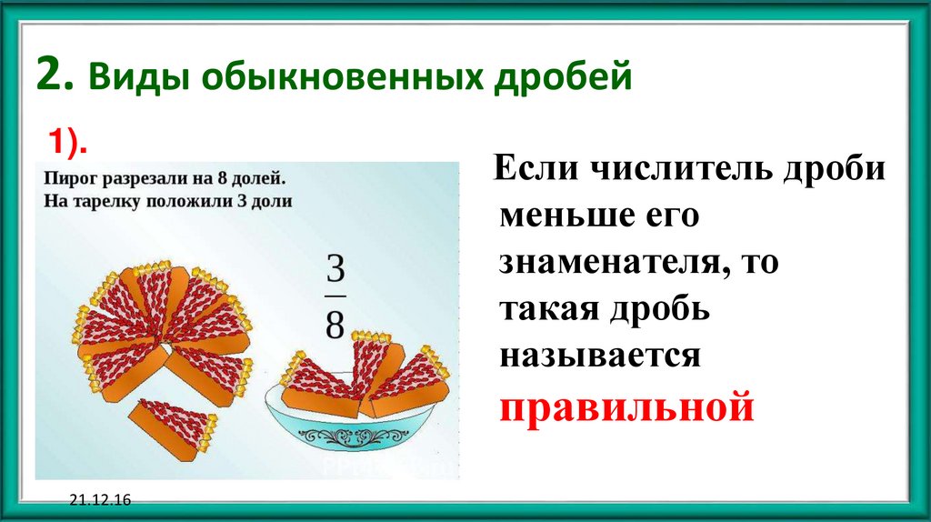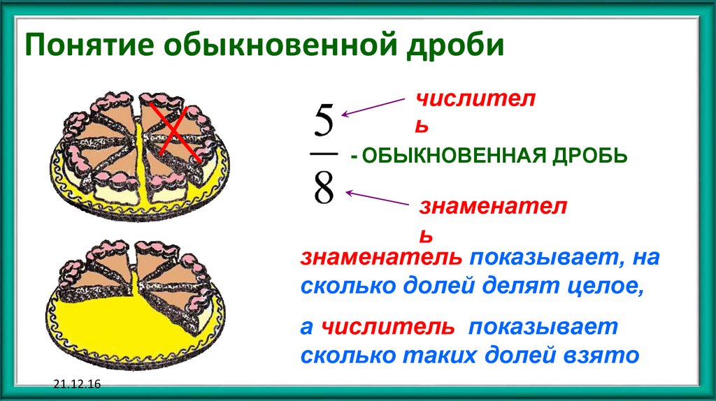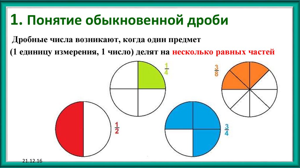 1. Понятие обыкновенной дробиДробные числа возникают, когда один предмет