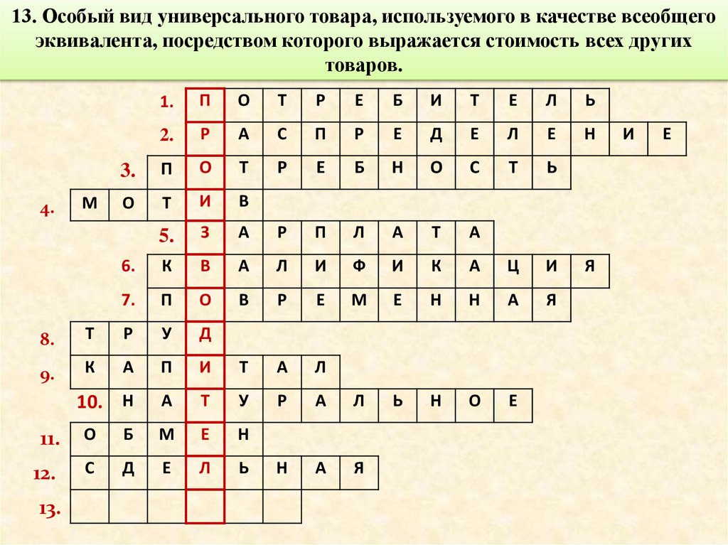 13. Особый вид универсального товара, используемого в качестве всеобщегоэквивалента, посредством которого выражается стоимость всех других