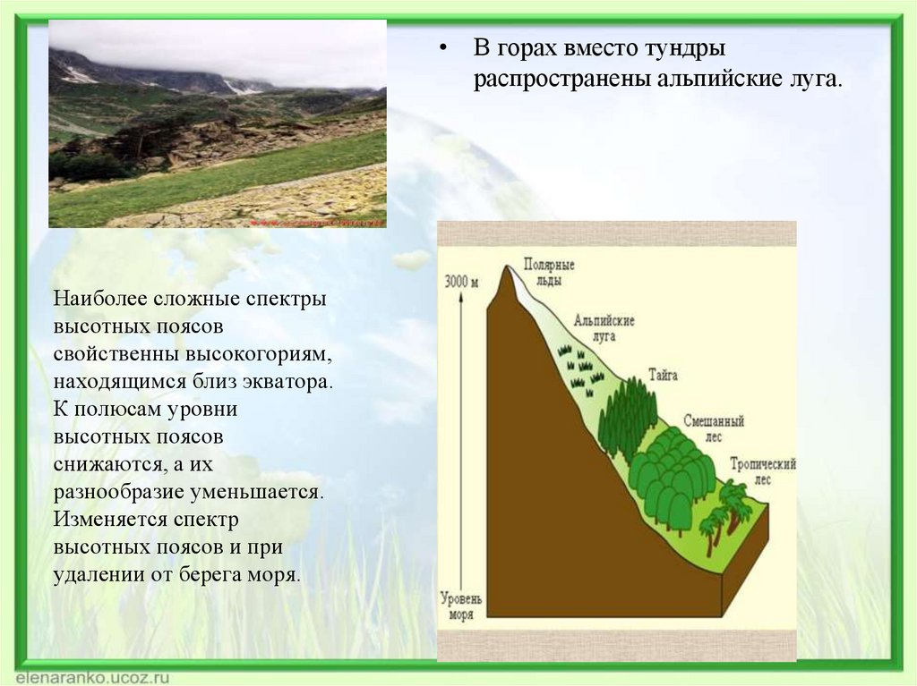 • В горах вместо тундрыраспространены альпийские луга.