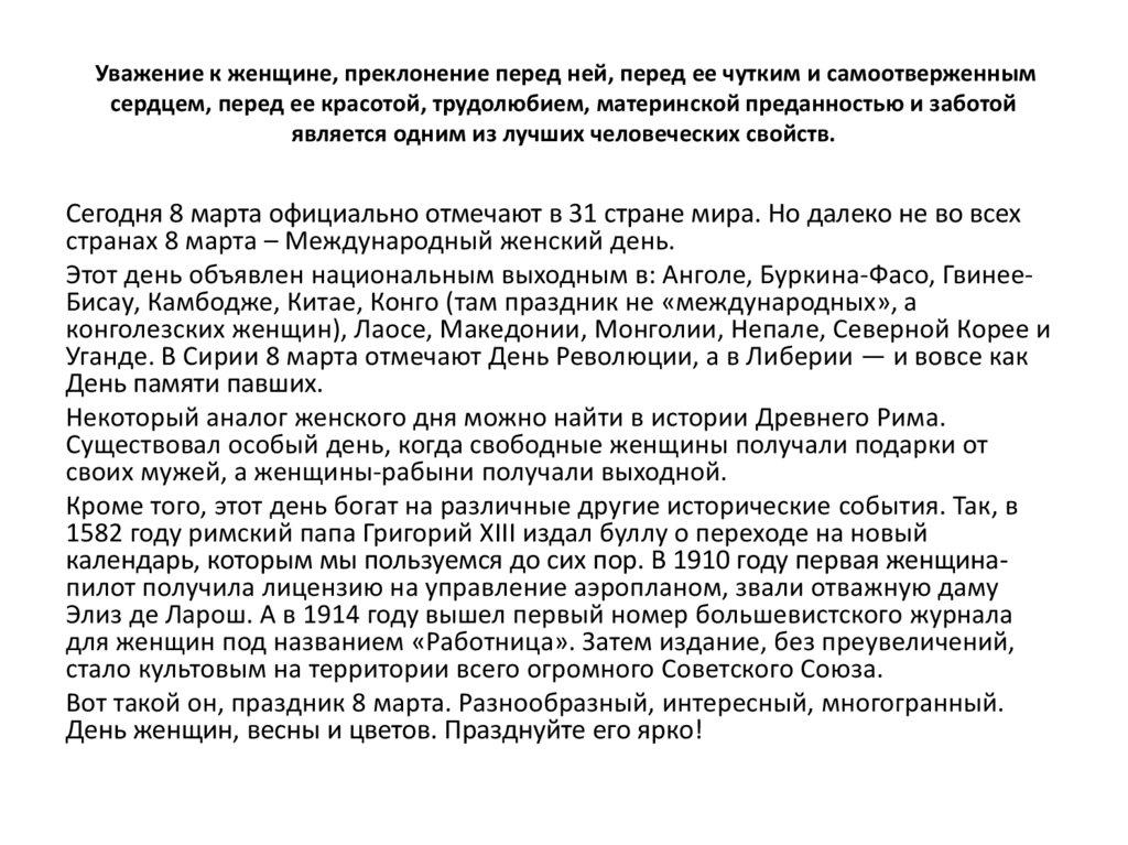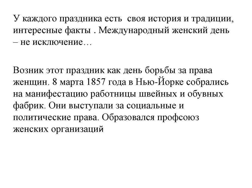 У каждого праздника есть своя история и традиции,интересные факты . Международный женский день