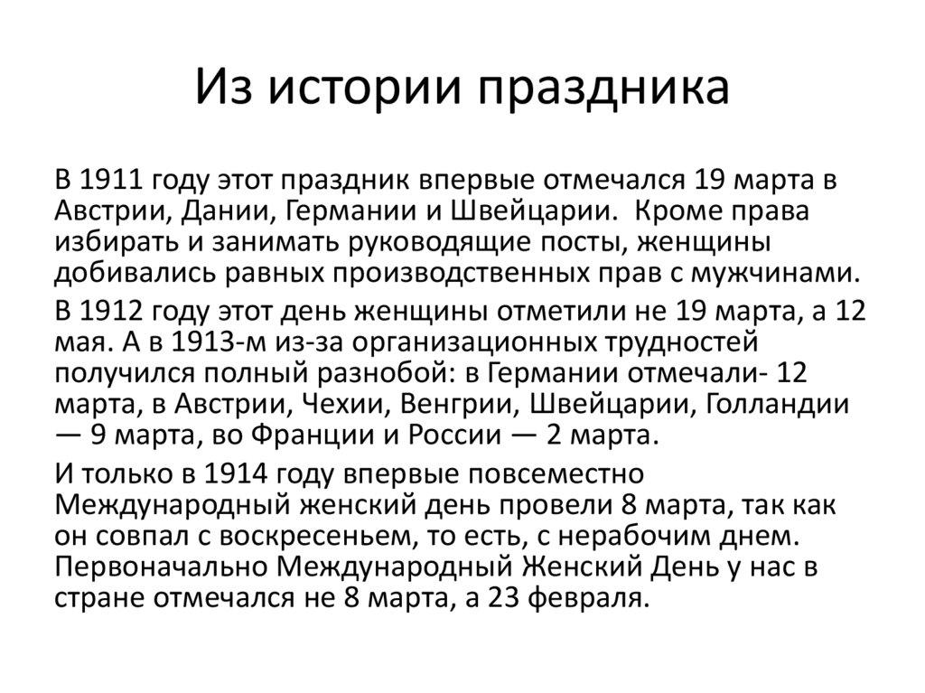 Из истории праздникаВ 1911 году этот праздник впервые отмечался 19 марта в