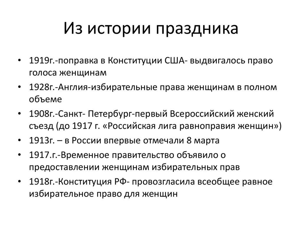 Из истории праздника• 1919г.-поправка в Конституции США- выдвигалось право