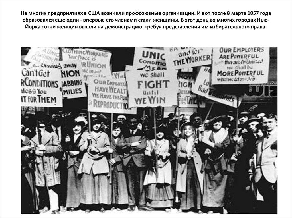 На многих предприятиях в США возникли профсоюзные организации. И вот после 8 марта 1857 годаобразовался еще один - впервые его членами стали женщины. В этот день во многих городах НьюЙорка сотни женщин вышли на демонстрацию, требуя представления им избирательного права.
