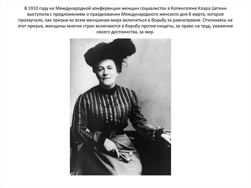 В 1910 году на Международной конференции женщин социалисток в Копенгагене Клара Цеткинвыступила с предложением о праздновании Международного женского дня 8 марта, которое