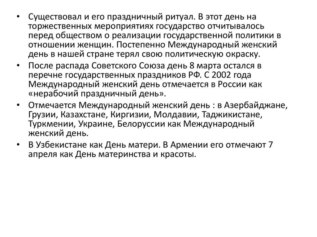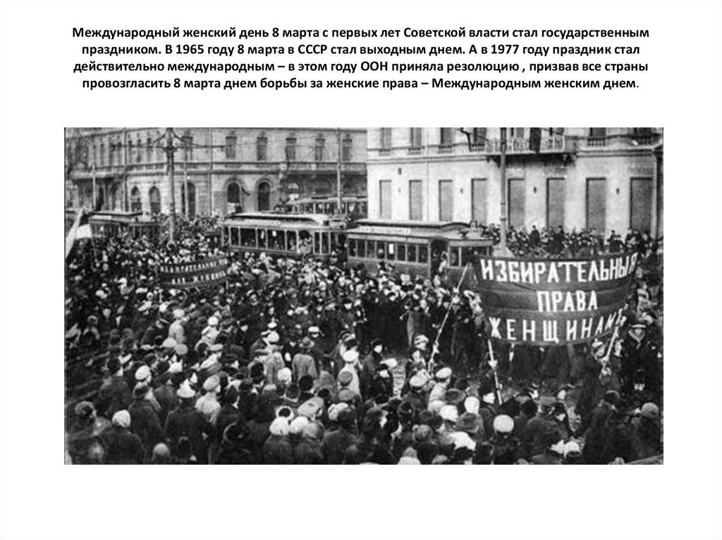 Международный женский день 8 марта с первых лет Советской власти стал государственнымпраздником. В 1965 году 8 марта в СССР стал выходным днем. А в 1977 году праздник стал