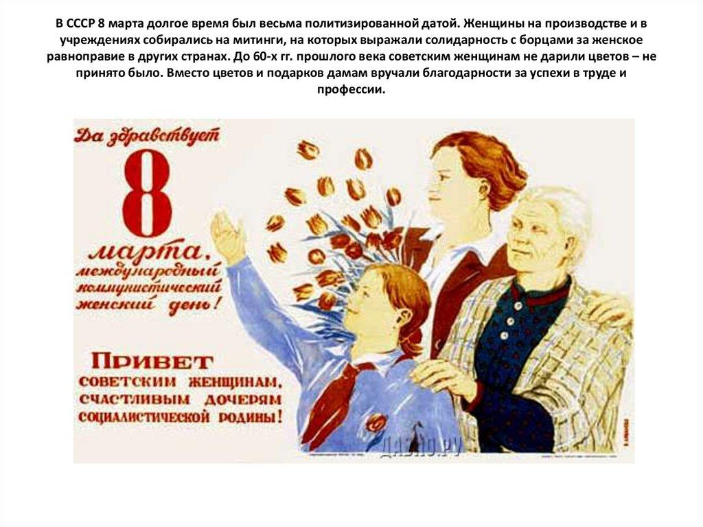 В СССР 8 марта долгое время был весьма политизированной датой. Женщины на производстве и вучреждениях собирались на митинги, на которых выражали солидарность с борцами за женское