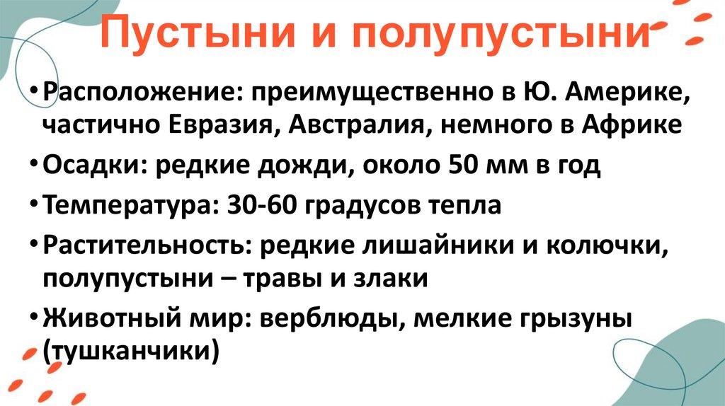 Пустыни и полупустыни• Расположение: преимущественно в Ю. Америке,