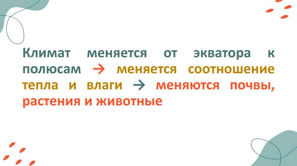 Климат меняется от экватора кполюсам → меняется соотношение