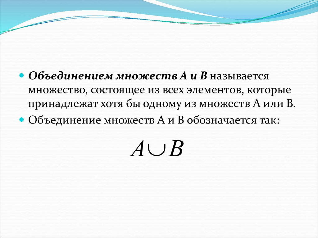 Объединением множеств А и В называетсямножество, состоящее из всех элементов, которые