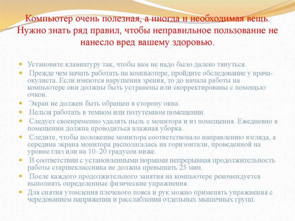 Компьютер очень полезная, а иногда и необходимая вещь.Нужно знать ряд правил, чтобы неправильное пользование не