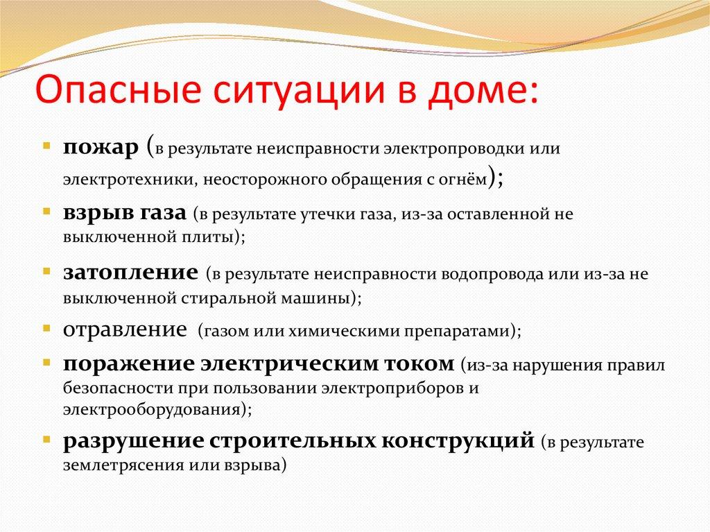 Опасные ситуации в доме:пожар (в результате неисправности электропроводки или
