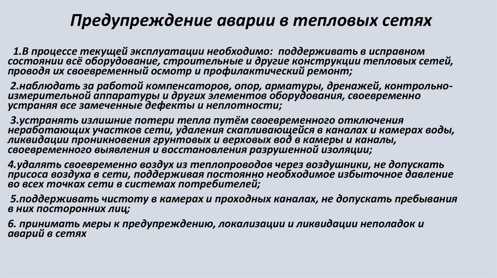 Предупреждение аварии в тепловых сетях1.В процессе текущей эксплуатации необходимо: поддерживать в исправном
