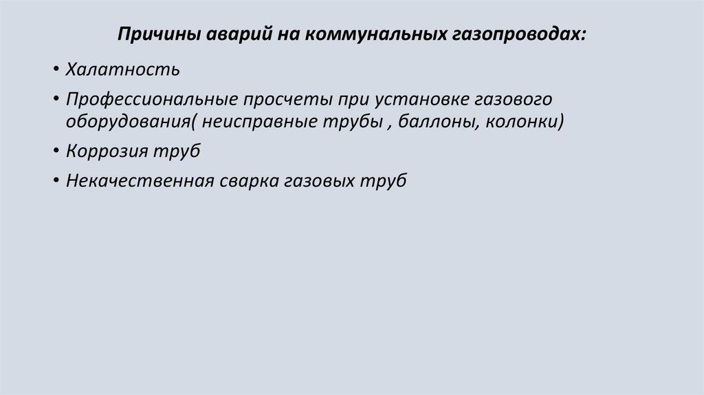Причины аварий на коммунальных газопроводах:• Халатность