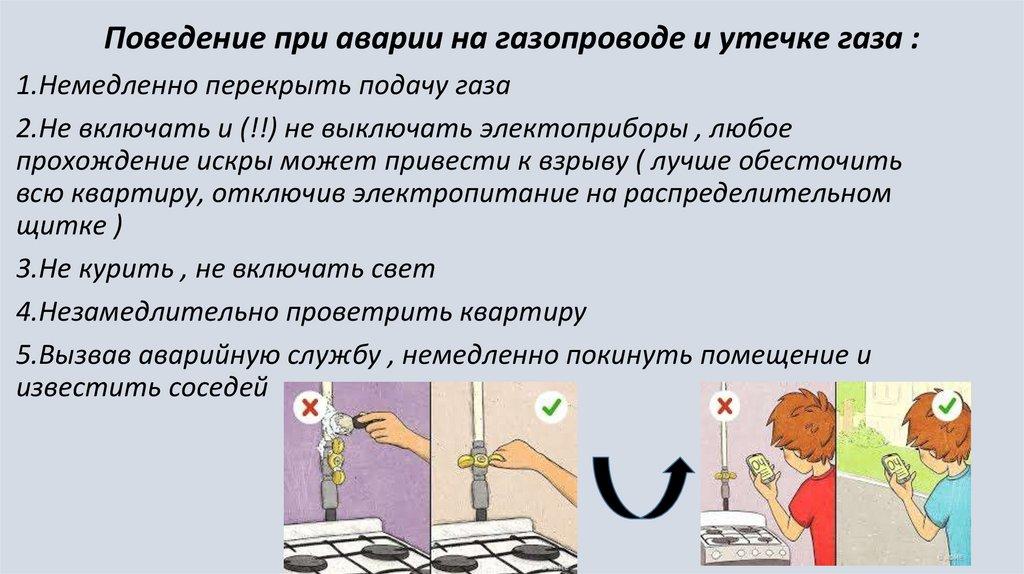 Поведение при аварии на газопроводе и утечке газа :1.Немедленно перекрыть подачу газа
