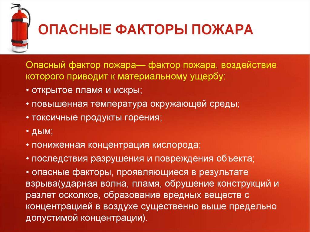 ОПАСНЫЕ ФАКТОРЫ ПОЖАРАОпасный фактор пожара— фактор пожара, воздействие