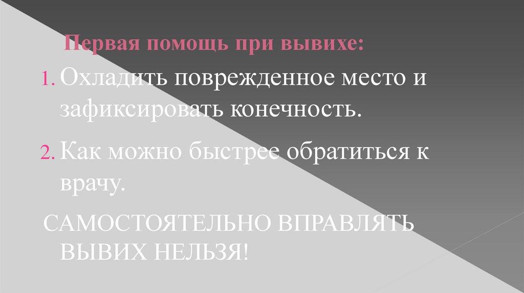 Первая помощь при вывихе:1. Охладить поврежденное место и