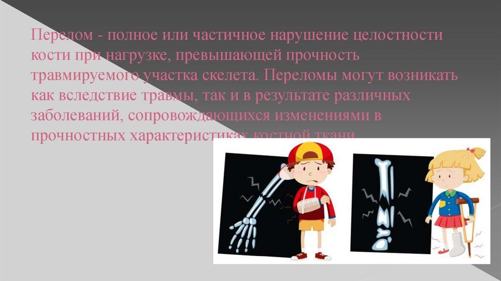 Перелом - полное или частичное нарушение целостностикости при нагрузке, превышающей прочность