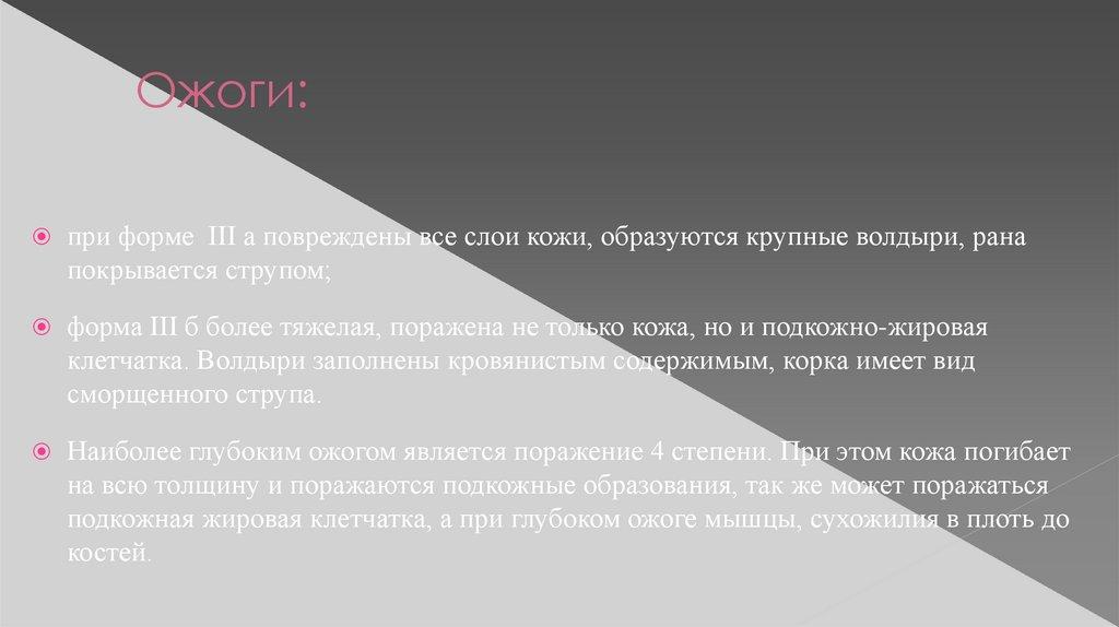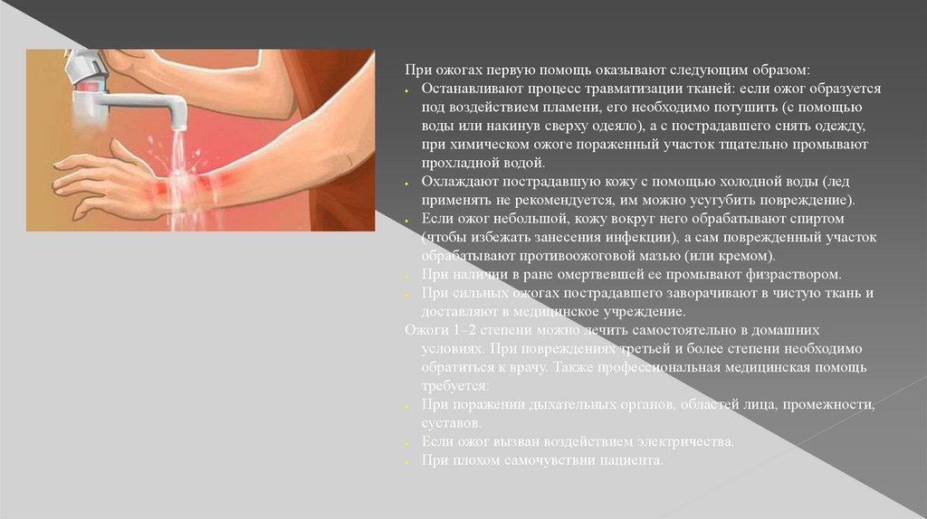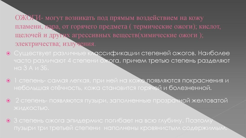ОЖОГИ- могут возникать под прямым воздействием на кожупламени, пара, от горячего предмета ( термические ожоги); кислот,