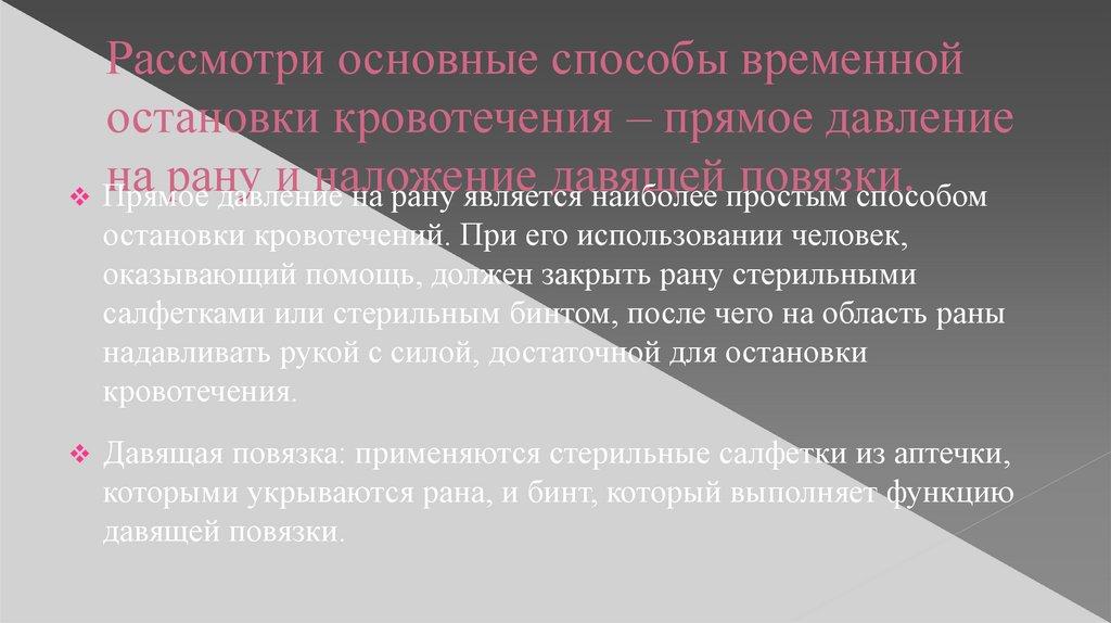 Рассмотри основные способы временнойостановки кровотечения – прямое давление