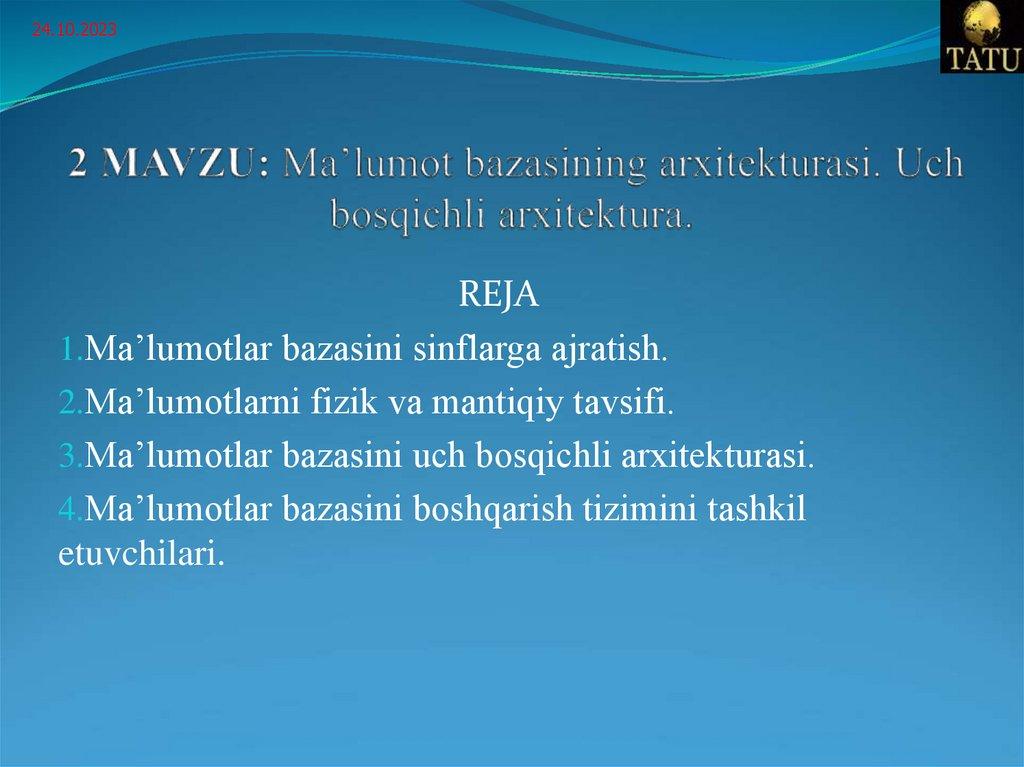 Ma’lumot bazasining arxitekturasi. Uch bosqichli arxitektura. 2 mavzu