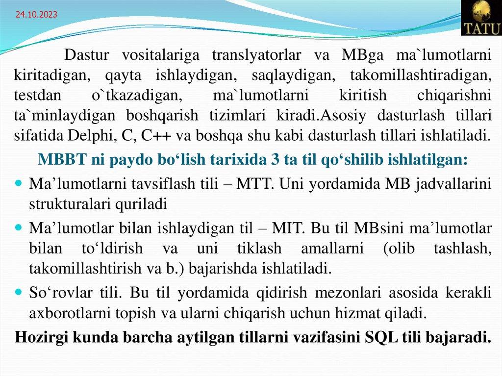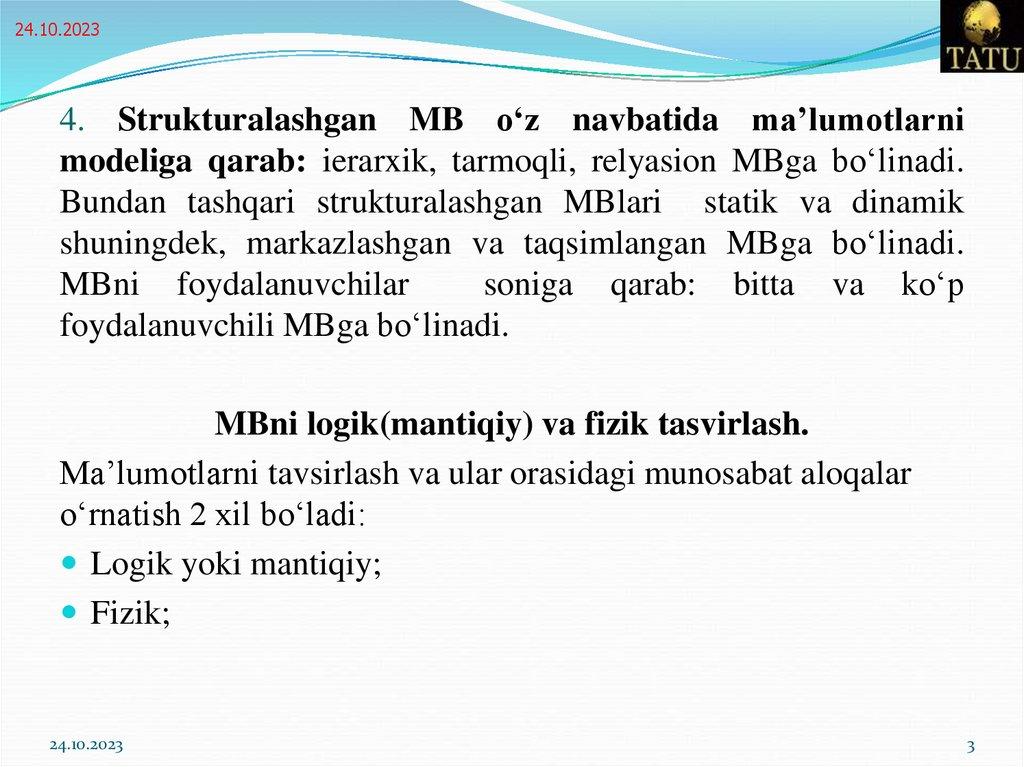 24.10.20234. Strukturalashgan MB o‘z navbatida ma’lumotlarni