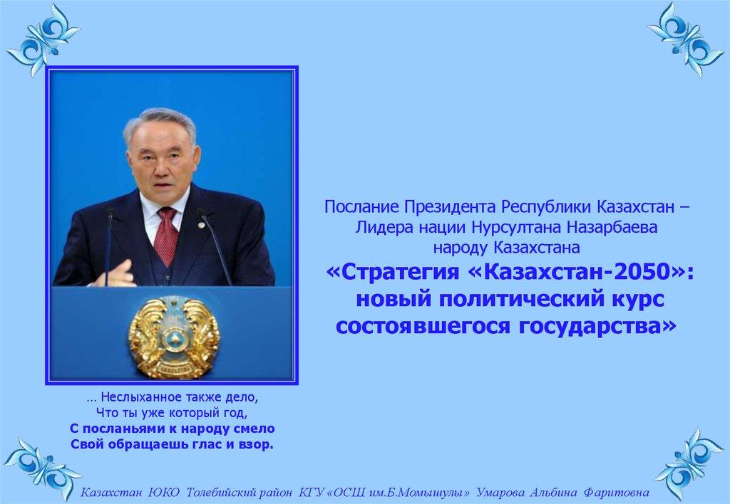 Послание Президента Республики Казахстан –Лидера нации Нурсултана Назарбаева народу Казахстана