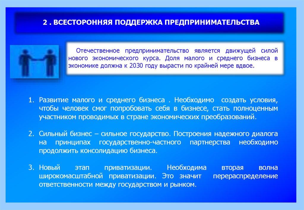 2 . ВСЕСТОРОННЯЯ ПОДДЕРЖКА ПРЕДПРИНИМАТЕЛЬСТВАОтечественное предпринимательство является движущей силой