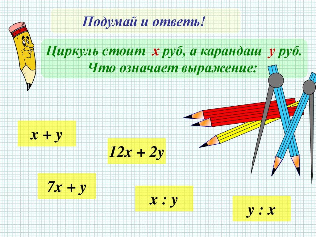 Подумай и ответь!Циркуль стоит х руб, а карандаш у руб.