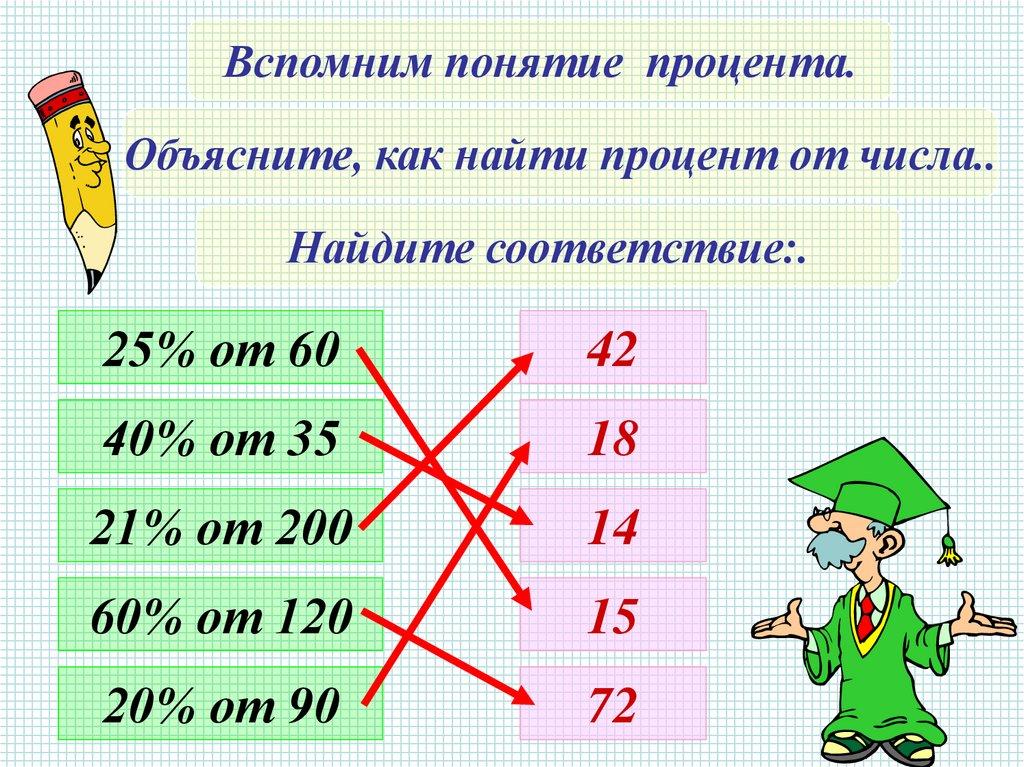 Вспомним понятие процента.Объясните, как найти процент от числа..