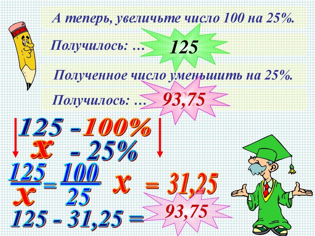 А теперь, увеличьте число 100 на 25%.Получилось: …