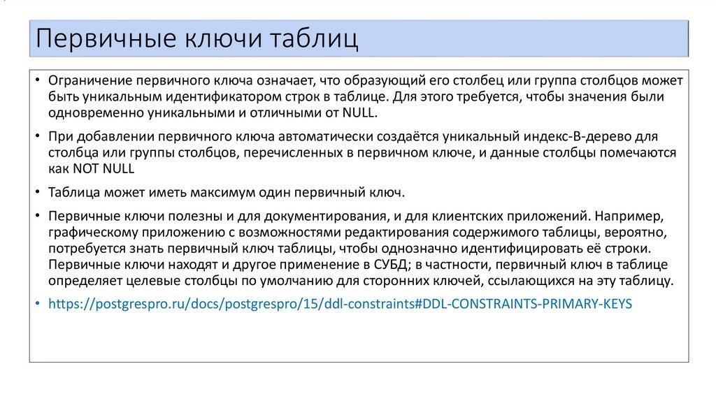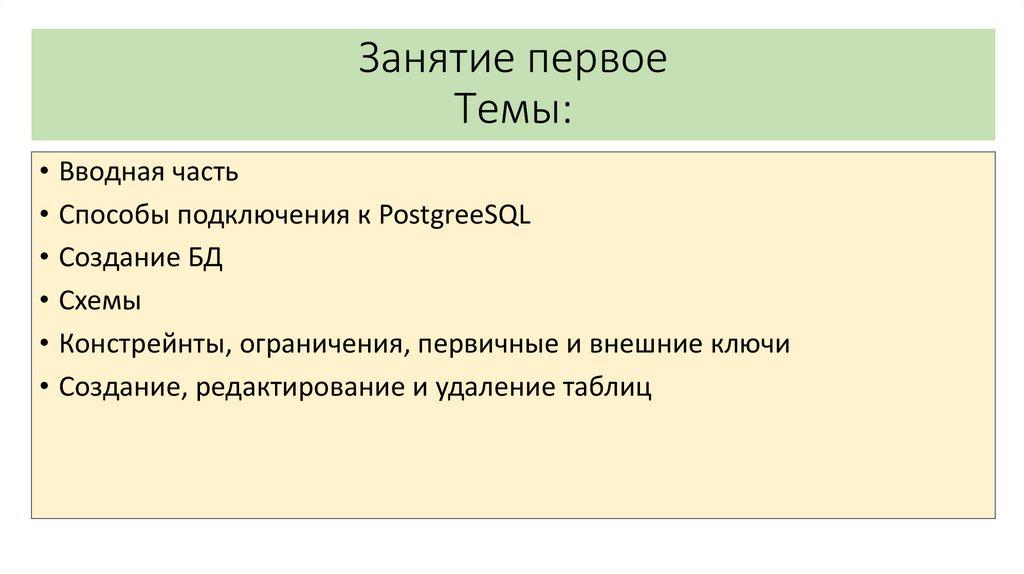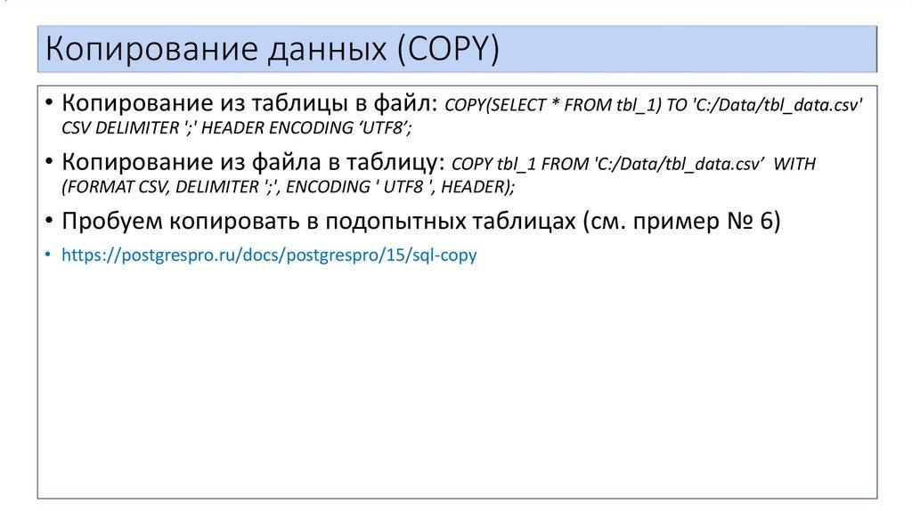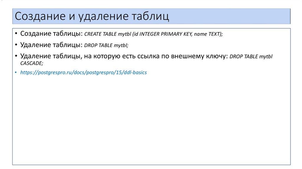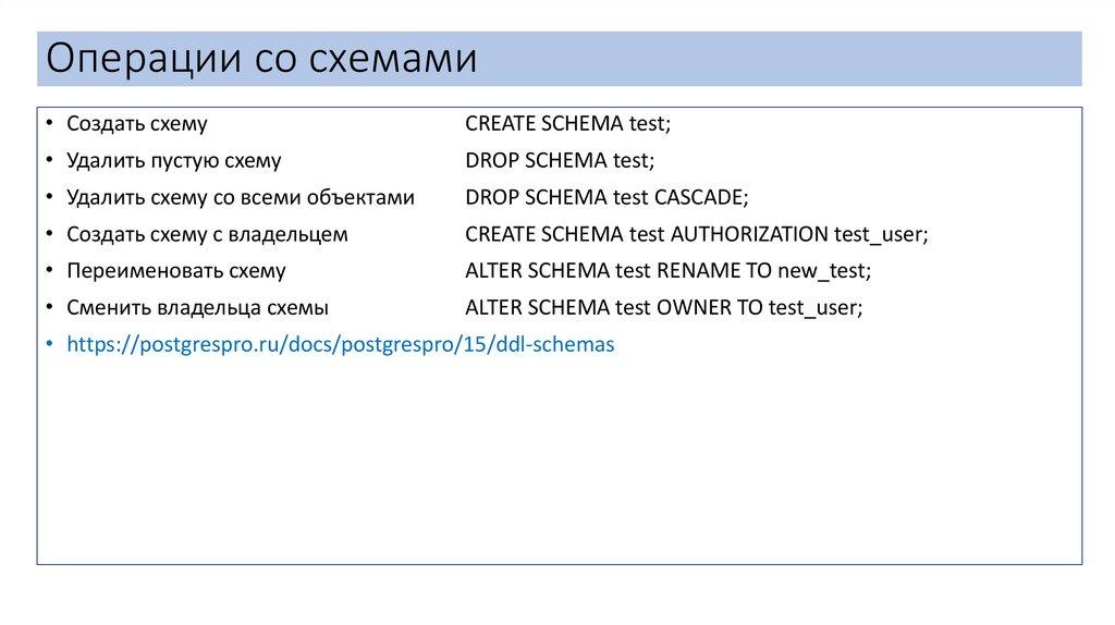 • Создание базы: CREATE DATABASE test_db WITH OWNER = postgres ENCODING ='UTF8' TABLESPACE =