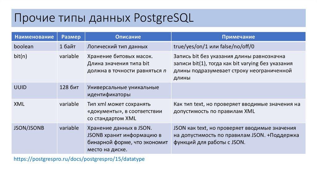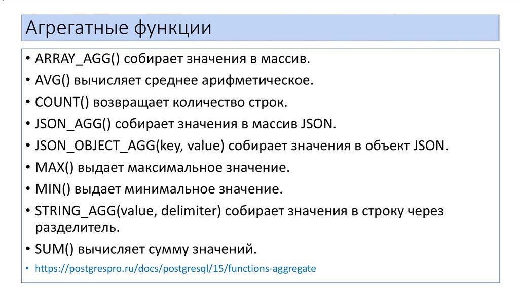 • https://postgrespro.ru/docs/postgresql/15/functions-aggregate