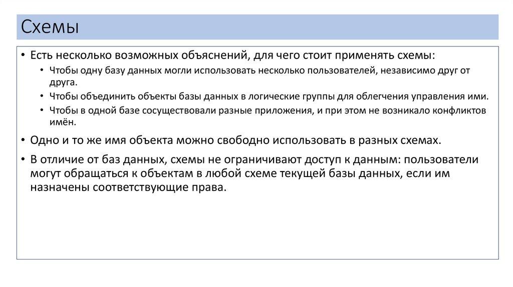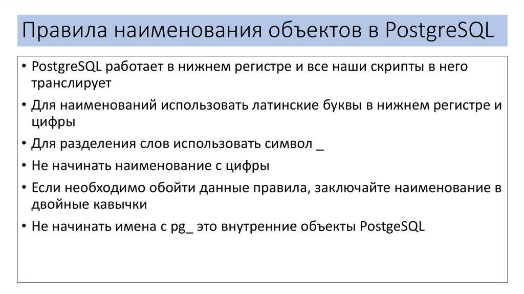 • Не начинать имена с pg_ это внутренние объекты PostgeSQL