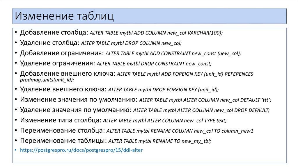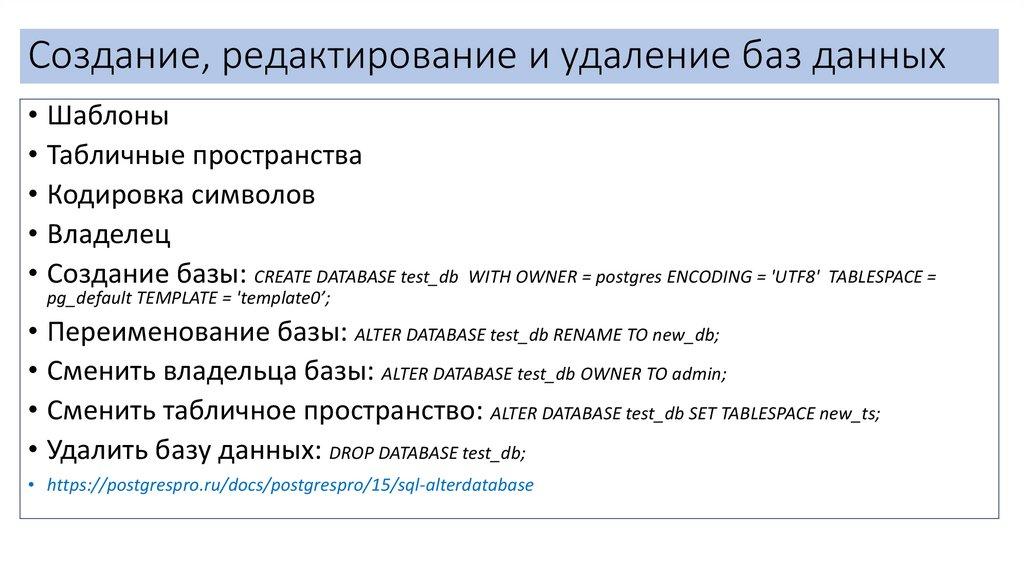 • Переименование базы: ALTER DATABASE test_db RENAME TO new_db;