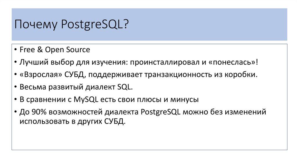• До 90% возможностей диалекта PostgreSQL можно без изменений