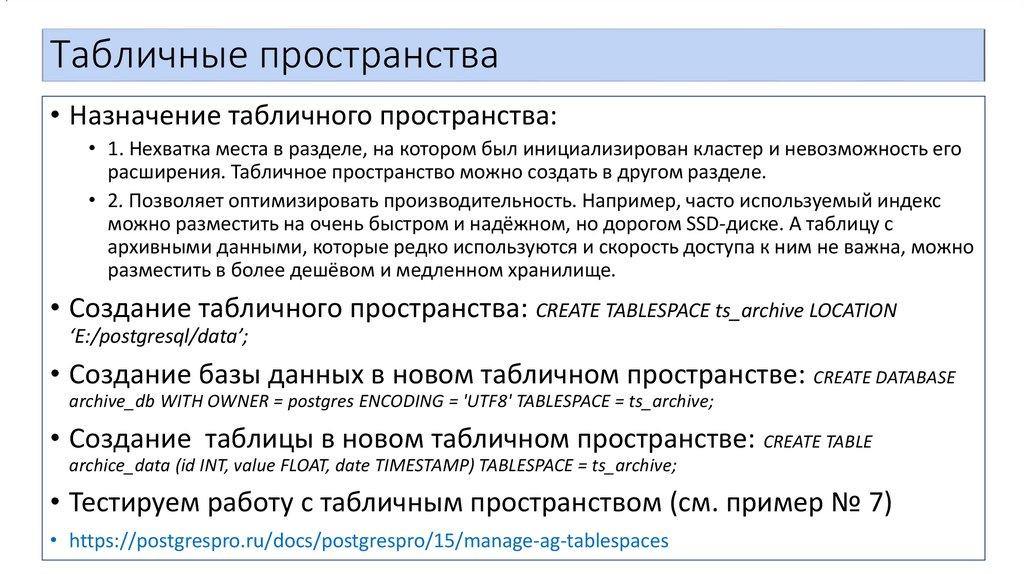 • Сменить табличное пространство: ALTER DATABASE test_db SET TABLESPACE new_ts;