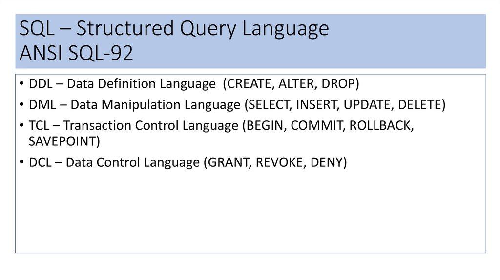 • DCL – Data Control Language (GRANT, REVOKE, DENY)