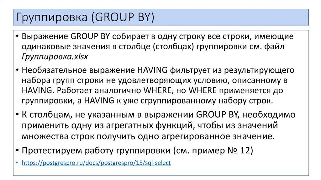 • Выражение GROUP BY собирает в одну строку все строки, имеющие