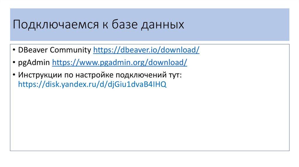 Подключаемся к базе данных• DBeaver Community https://dbeaver.io/download/
