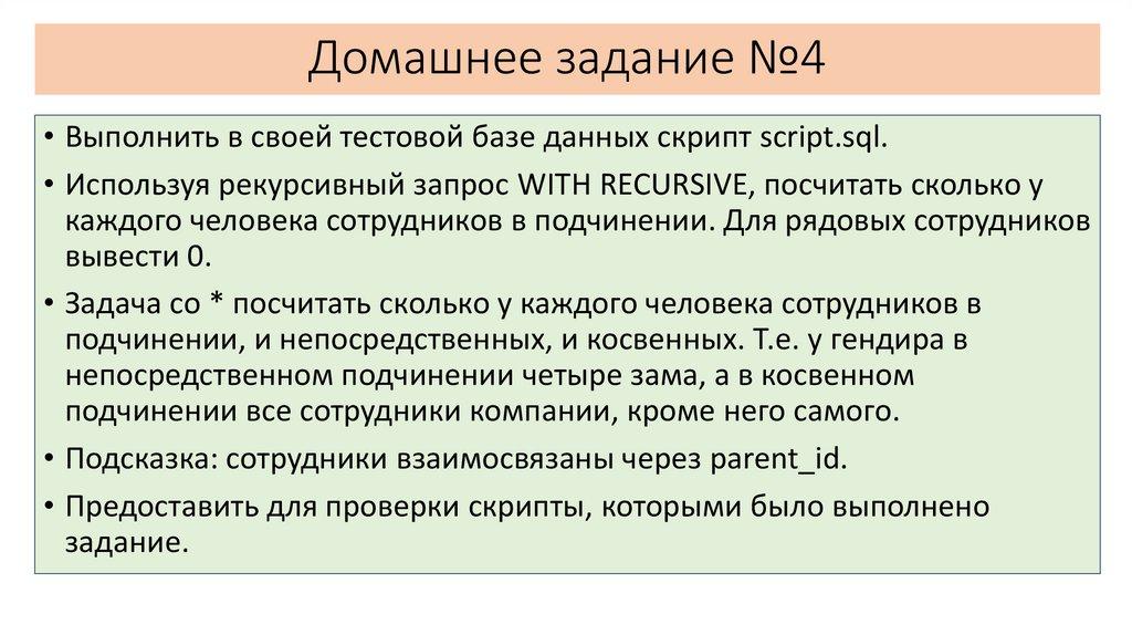 • Используя рекурсивный запрос WITH RECURSIVE, посчитать сколько у