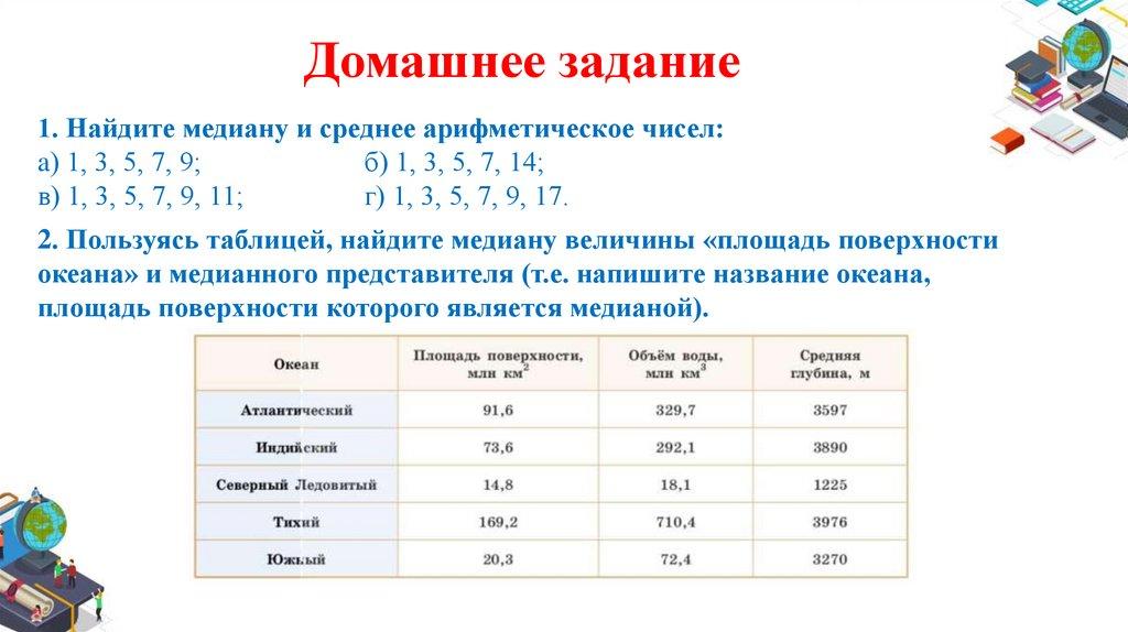Домашнее задание1. Найдите медиану и среднее арифметическое чисел: