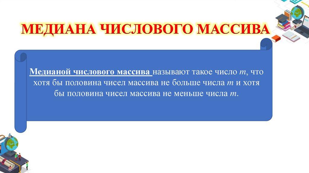 МЕДИАНА ЧИСЛОВОГО МАССИВАМедианой числового массива называют такое число m, что