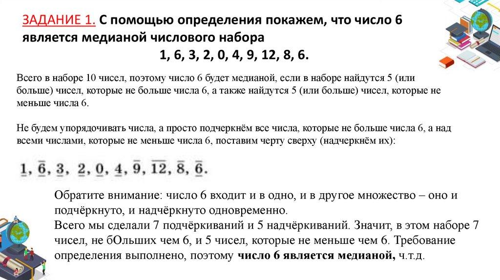 ЗАДАНИЕ 1. С помощью определения покажем, что число 6является медианой числового набора