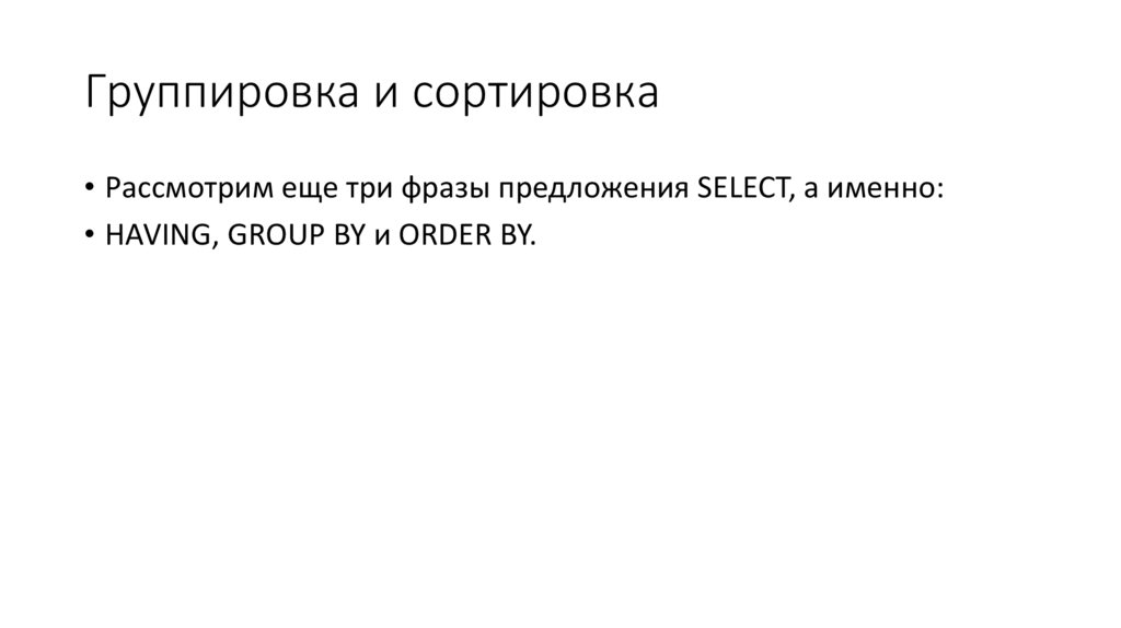 Группировка и сортировка• Рассмотрим еще три фразы предложения SELECT, а именно: